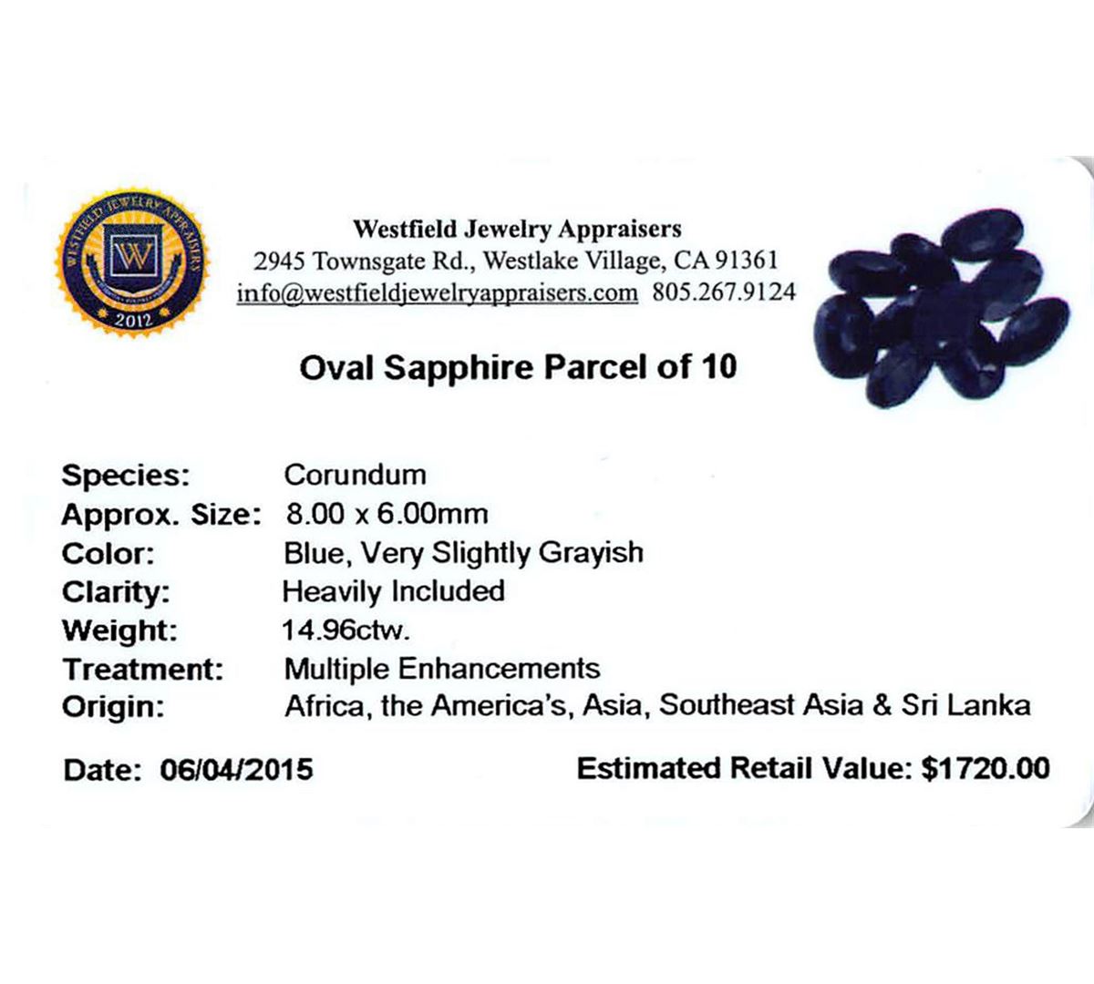 Ten oval mixed cut natural blue sapphires, measuring 8.00 x 6.00 x 4.00mm, exact total weight 14.96ct., clarity is heavily included, type II, very dark, very slightly grayish, blue color, (GIA B 8/3), cut is good. Measurements are an average for the group. Transmitting light diffusely, opaque. Naturally occurring internal & external characteristics are present. Indications of multiple laboratory enhancements. Westfield Appraised at $1,720.00.
