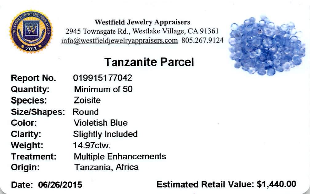 Fifty round mixed cut natural tanzanites, measuring 2.00 - 2.00 x 1.30 mm, exact total weight 14.97ct., clarity is slightly included, type I, medium, very slightly grayish, violetish blue color, (GIA vB 5/3), cut is good. Measurements & the color grade are an average for the group, Color grade is an average for the group, Transmitting light with no distortion, transparent, Naturally occurring internal & external characteristics are present, Indications of multiple laboratory enhancements, including high temperature heat treatment. Westfield Appraised at $1,440.00.