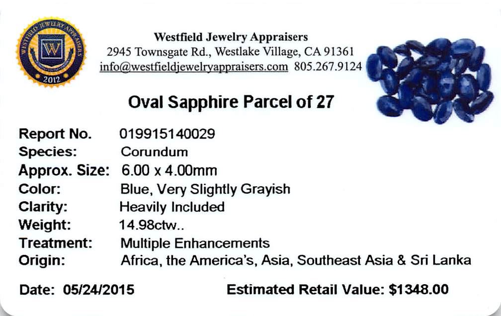 Twenty-seven oval mixed cut natural blue sapphires, measuring 6.00 x 4.00 x 2.60mm, exact total weight 14.98ct., clarity is heavily included, type II, dark, very slightly grayish, blue color, (GIA B 7/3), cut is good. Indications of multiple laboratory enhancements, including high temperature heat treatment. Westfield Appraised at $1,347.81.