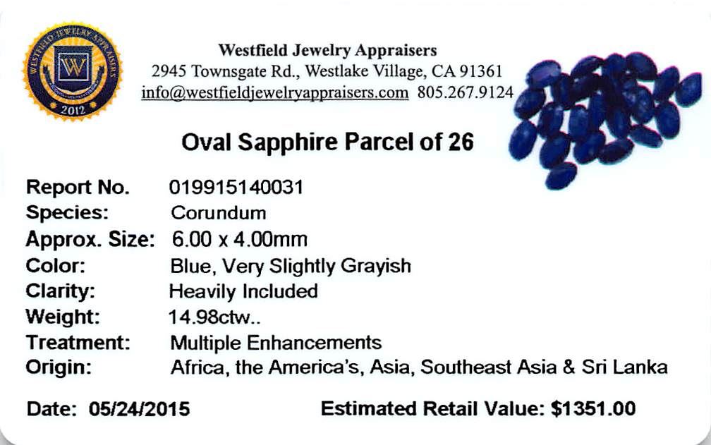 Twenty-six oval mixed cut natural blue sapphires, measuring 6.00 x 4.00 x 0.00mm, exact total weight 14.98ct., clarity is heavily included, type II, dark, very slightly grayish, blue color, (GIA B 7/3), cut is good. Indications of multiple laboratory enhancements, including high temperature heat treatment. Westfield Appraised at $1,351.31.