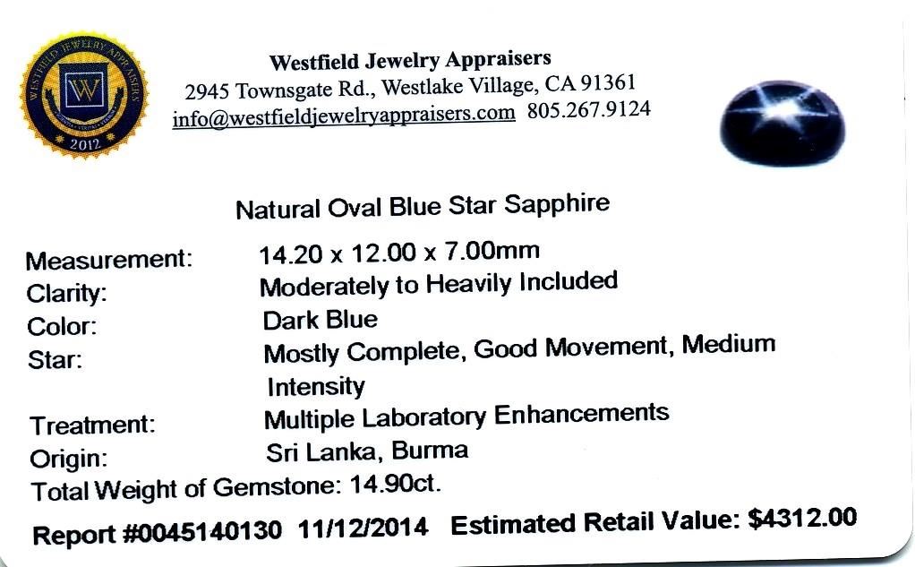 14.9ctw. Natural Oval Blue Star Sapphire. Westfield Appraised at $4,312.00.