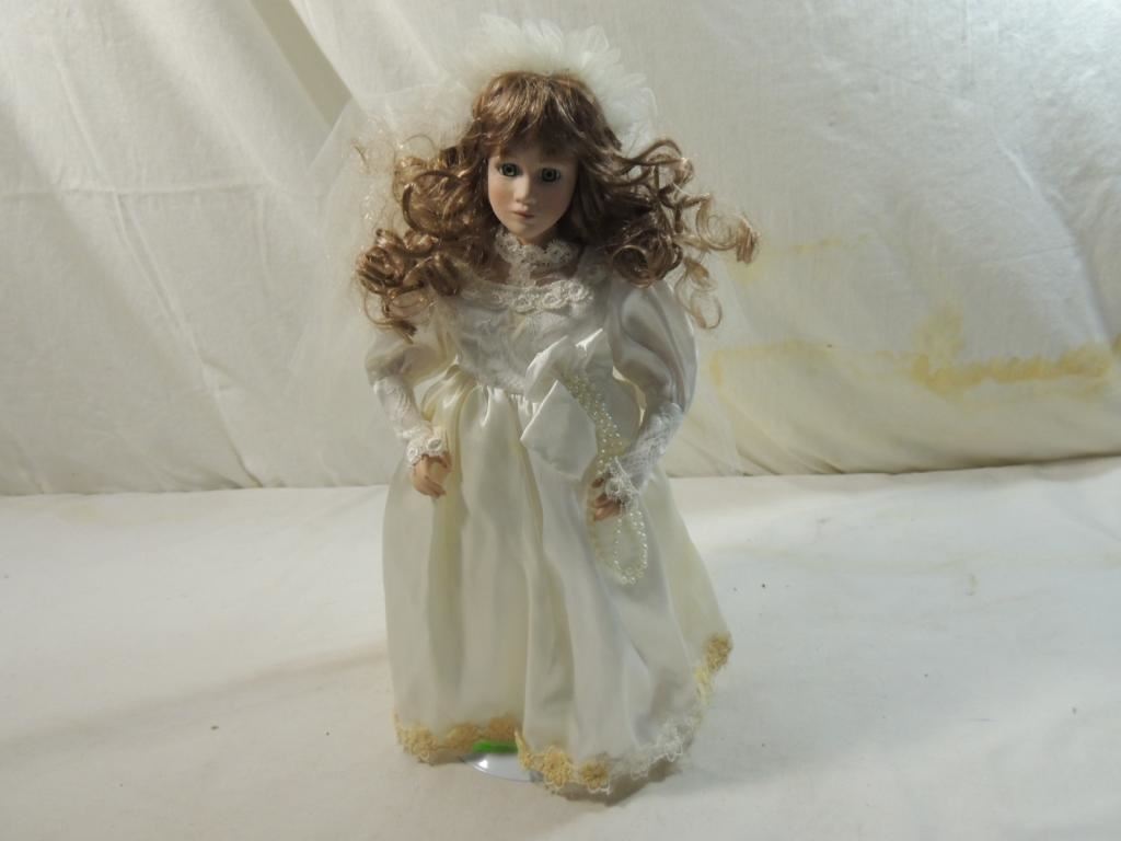 SATIN & LACE WITH PEARL BEAD DETAILS. LIGHT BROWN ASH BROWN HAIR BLUE EYES PORCELAIN DOLL, 14" TALL ON STAND BEAUTIFUL GOOD CONDITION COLLECTIBLE FROM PRIVATE DOLL COLLECTION. AS SHOWN SEE PHOTO FOR MORE DETAILS.