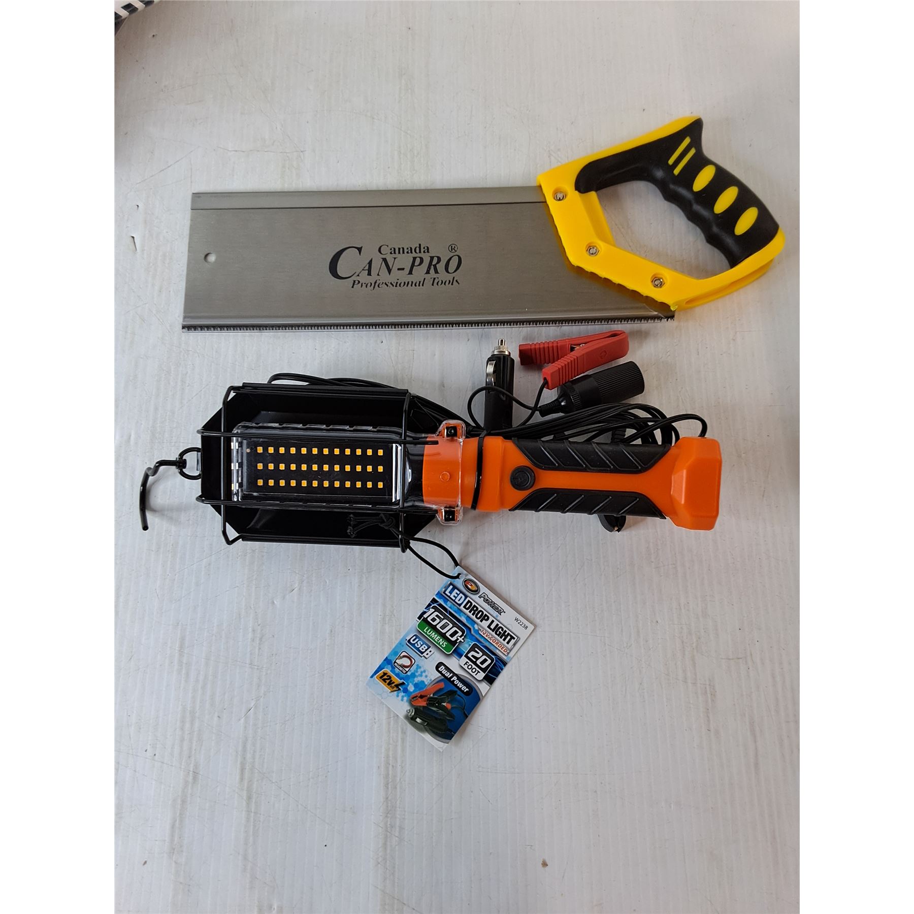 14" Back Saw, LED Drop Light, Rope, Misc.