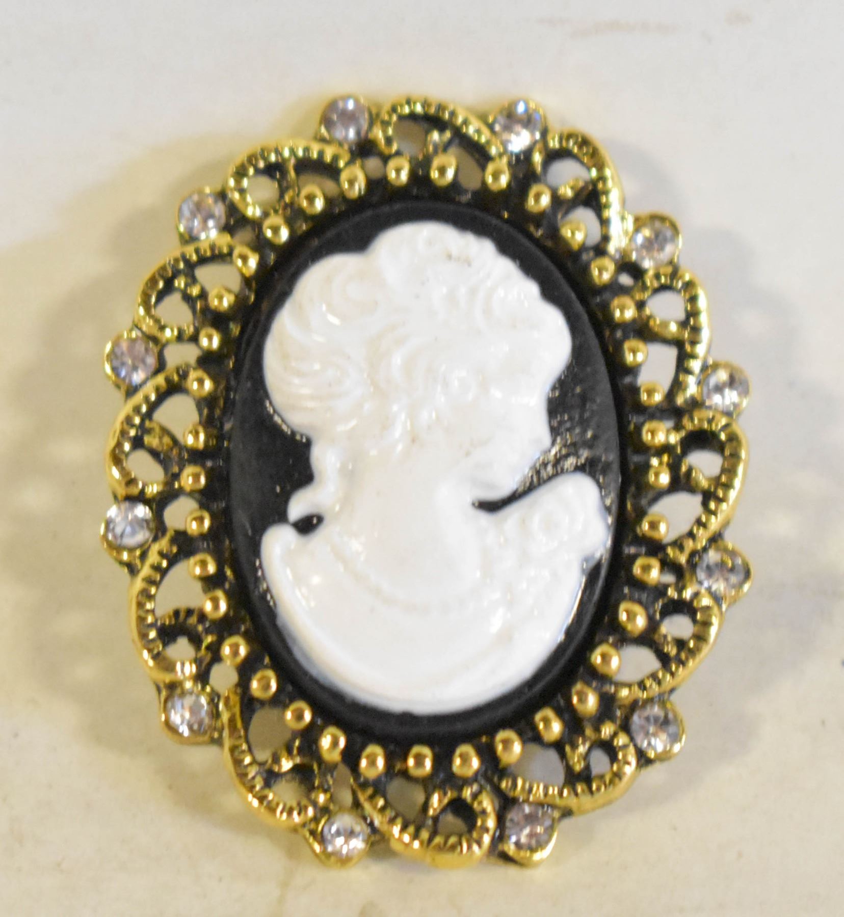 BACKROUND & GOLD TONE WITH CLEAR CRYSTALS FILAGREE SETTING. JEWELERY
