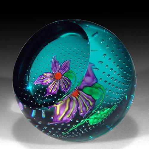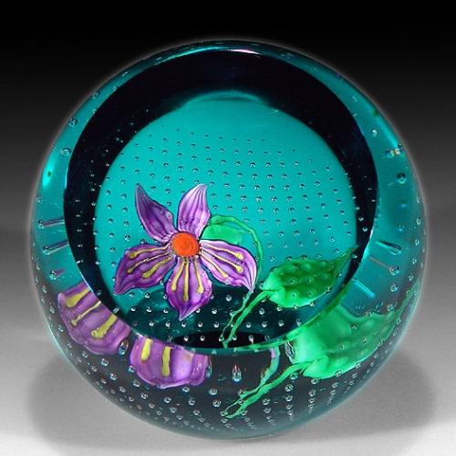 Caithness Glass "November - Violet" paperweight, with a single purple flower against a background of tiny spaced bubbles, on translucent blue ground. Front window facet. Signed. Diameter 2 5/8". NO RESERVE