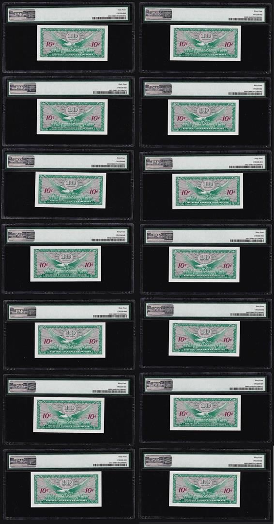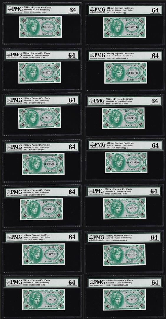 One (14) Consecutive 10 Cent Military Payment Certificates Series 641 PMG CU64. PMG Certified.