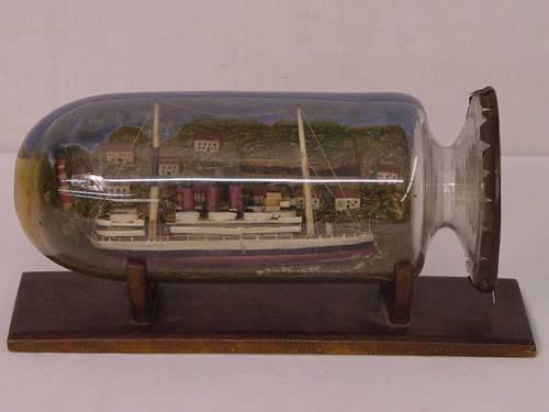 14" EARLY 20TH CENT. SHIP DIORAMA IN GLASS JAR- STEAMSHIP W/ LANDSCAPE BACKGROUND ON WOODEN STAND - IMPERFECTIONS;