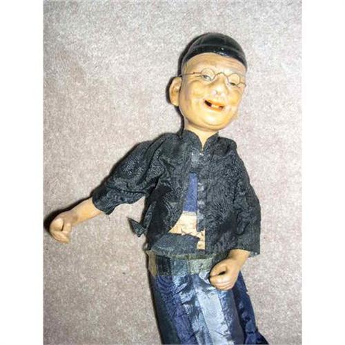 14" Early Composition Chinese Doll Newspaper wrapped body.Great molded face.He wears wire glasses. Loose lower legs, not sure is they were attached by paper or what, they just swing down. Old tape to wrap around material over pants. Doll comes from a smoke free environment. Buyer to pay $10 for shipping, handling, and insurance. Thanks for viewing.