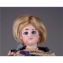 14” FG FASHION. A swivel neck fashion on a gusseted kid French fashion body body is worn and dirty). An elaborate fashion outfit with bustle and train of newer vintage highlights this young lady. CONDITION: Doll lacking shoes, whiteness to tip of nose with pinpoint black speck. JL 1-2603