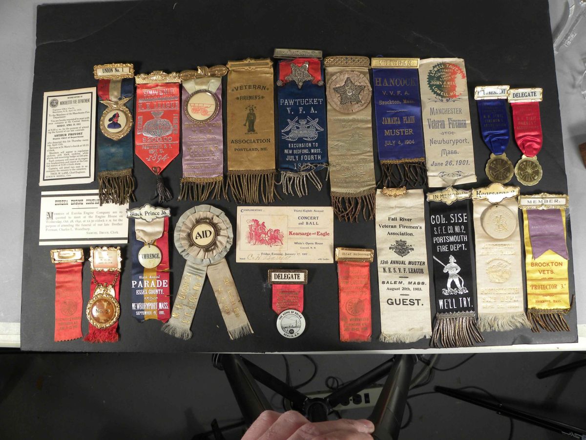 Lot of 20 Firemen's Muster Ribbons and 3 postcards. Various New England Towns. Dated 1891-1951. Various sizes and conditions.