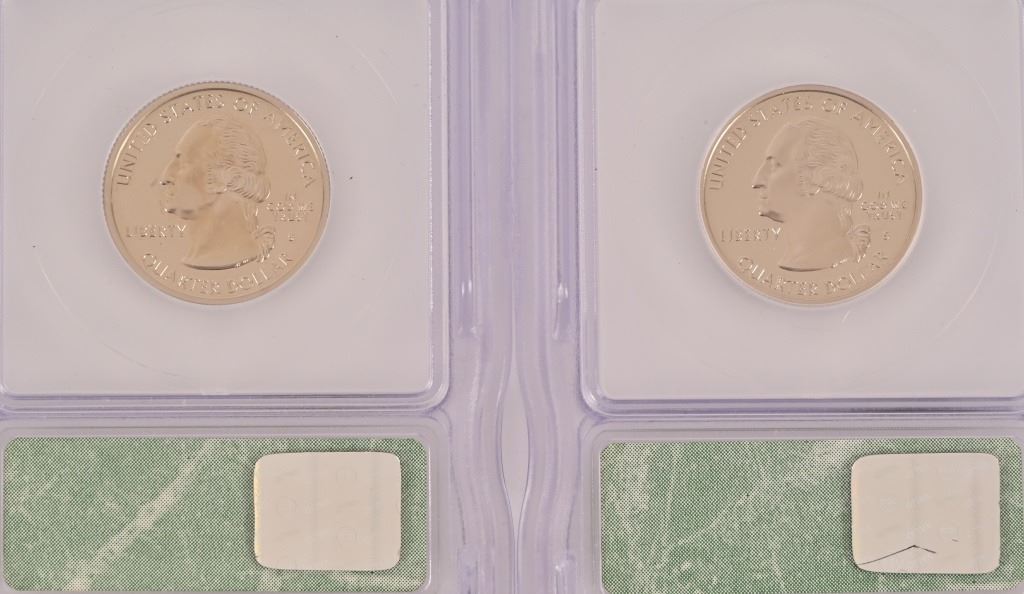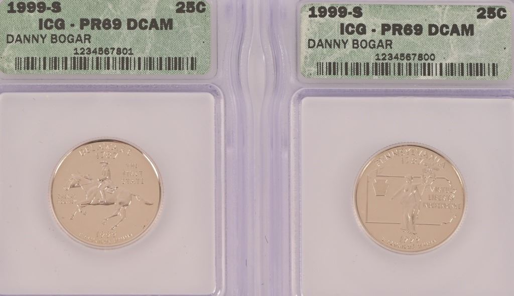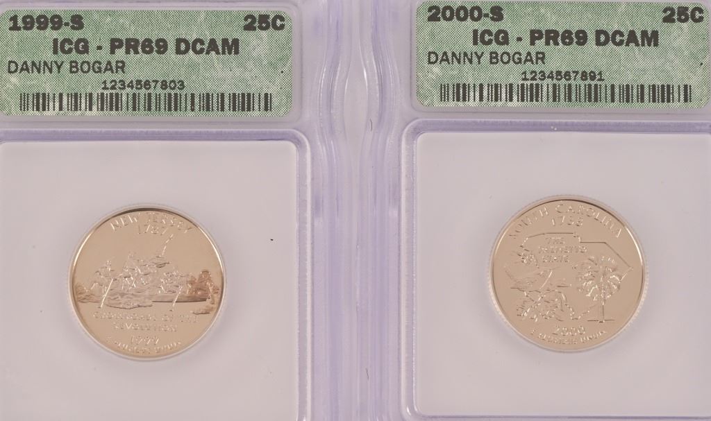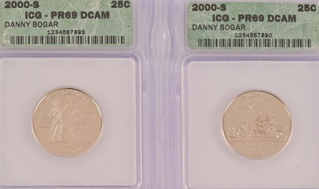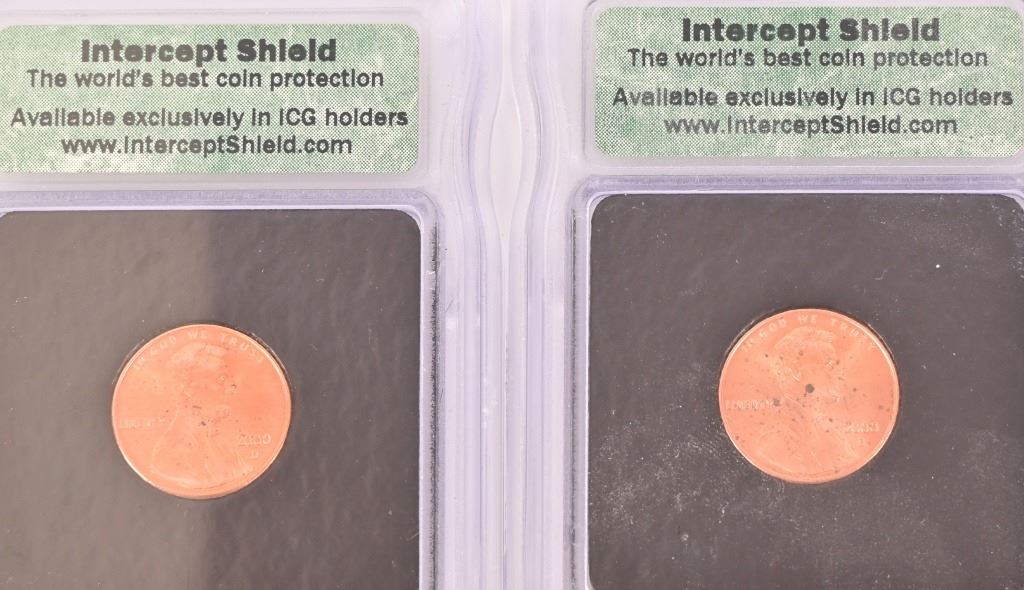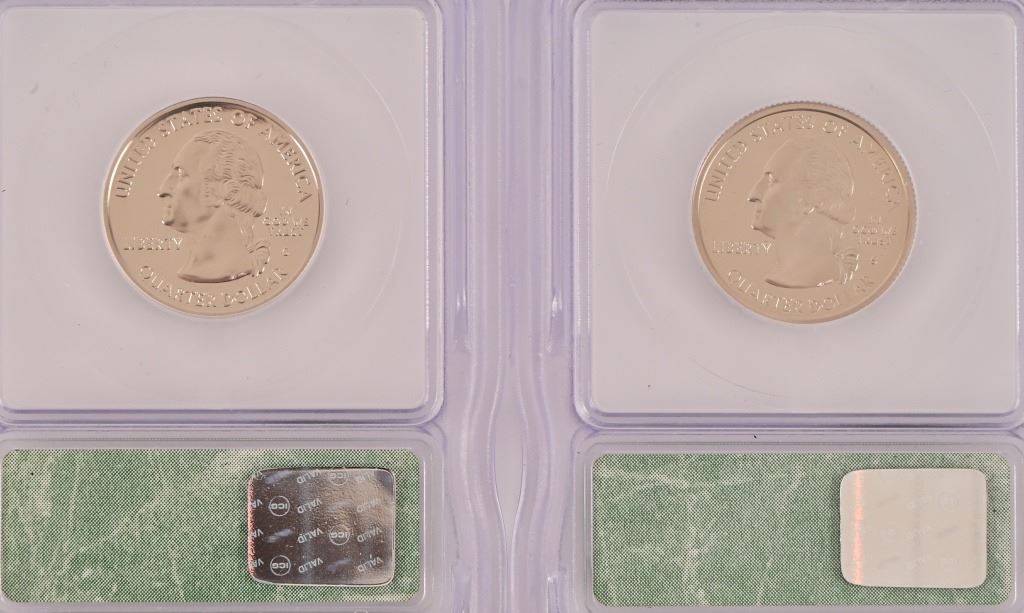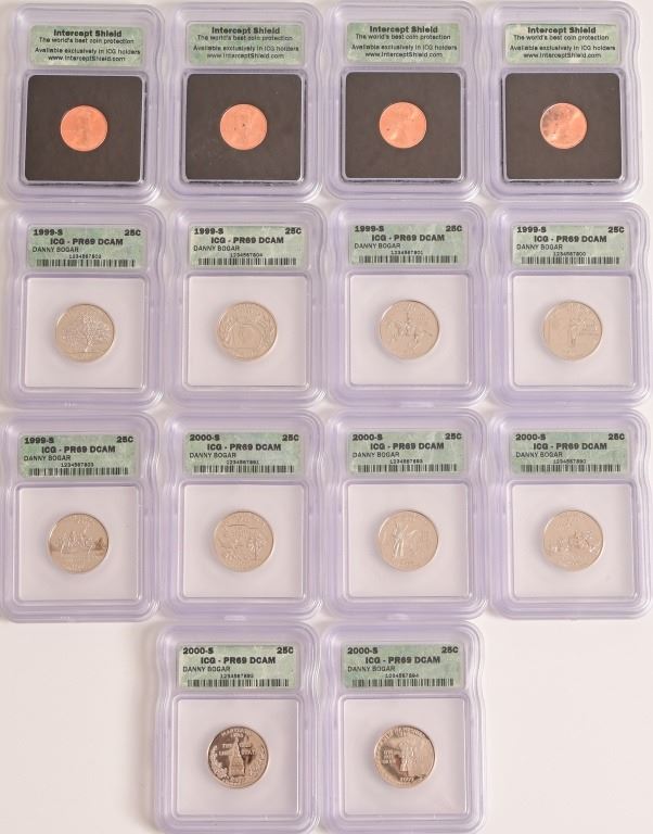 Collection of (4) 2000-D Lincoln Memorial Penny Intercept Shield ICG Sample Slab (10) PR 69 ICG US State Quarters (1999-2000) 5 of each.
