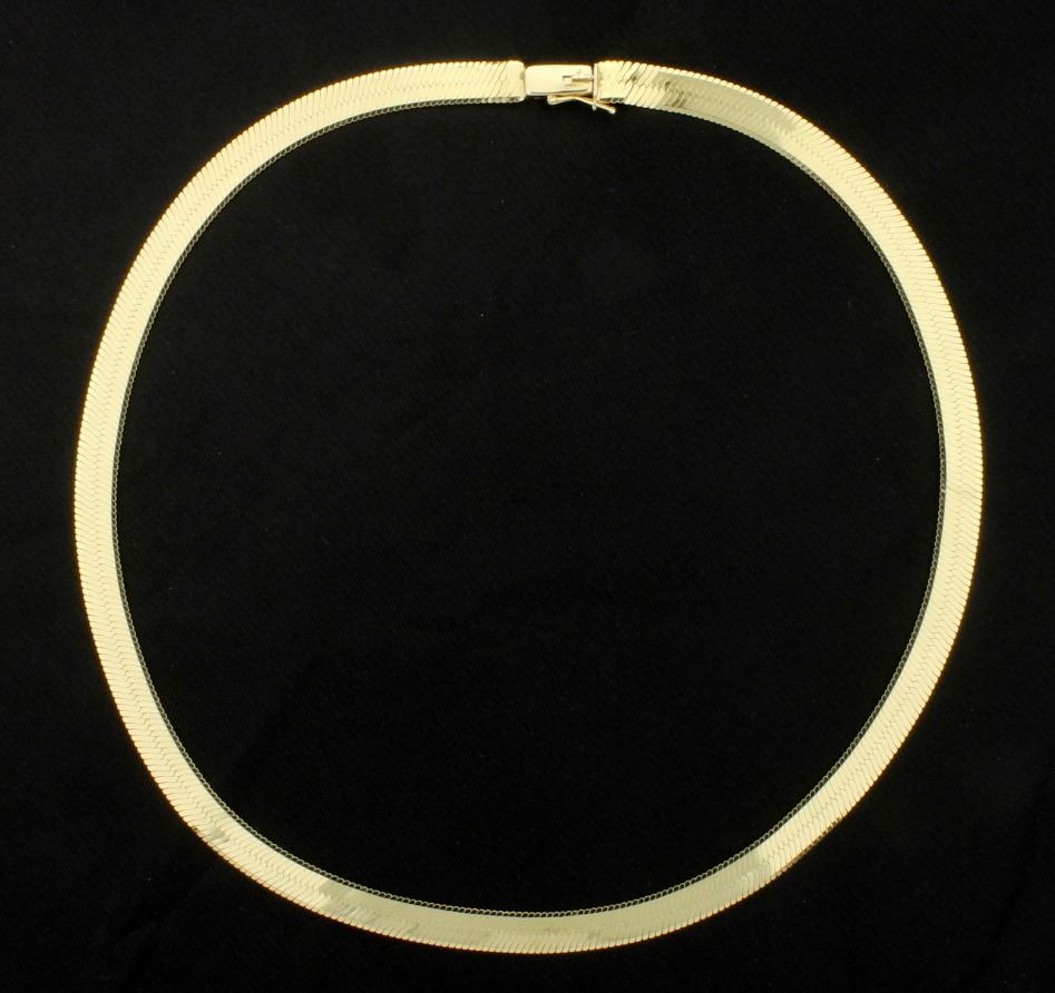 This necklace is 14K yellow gold and is 5.3mm wide. 12.1g