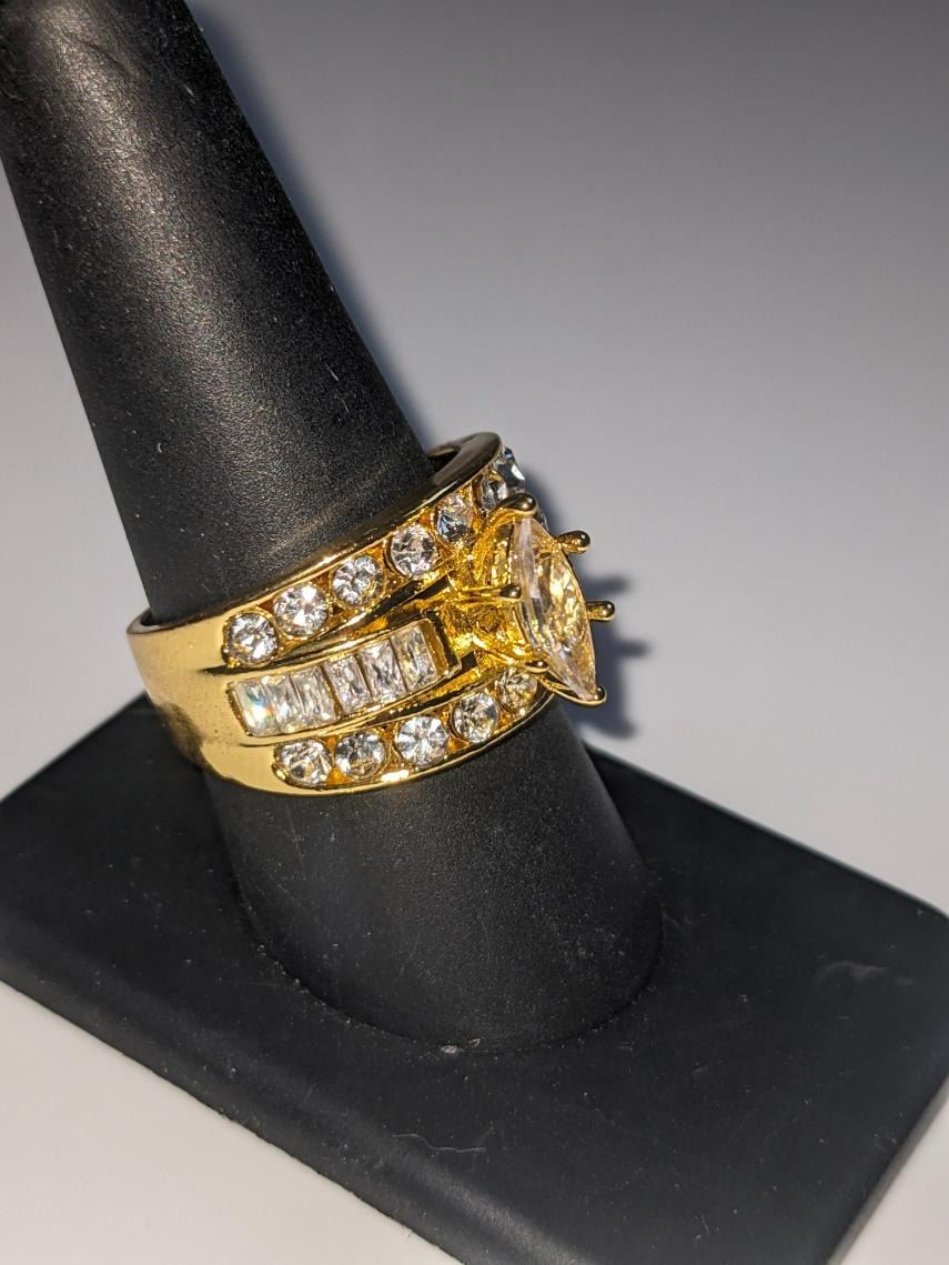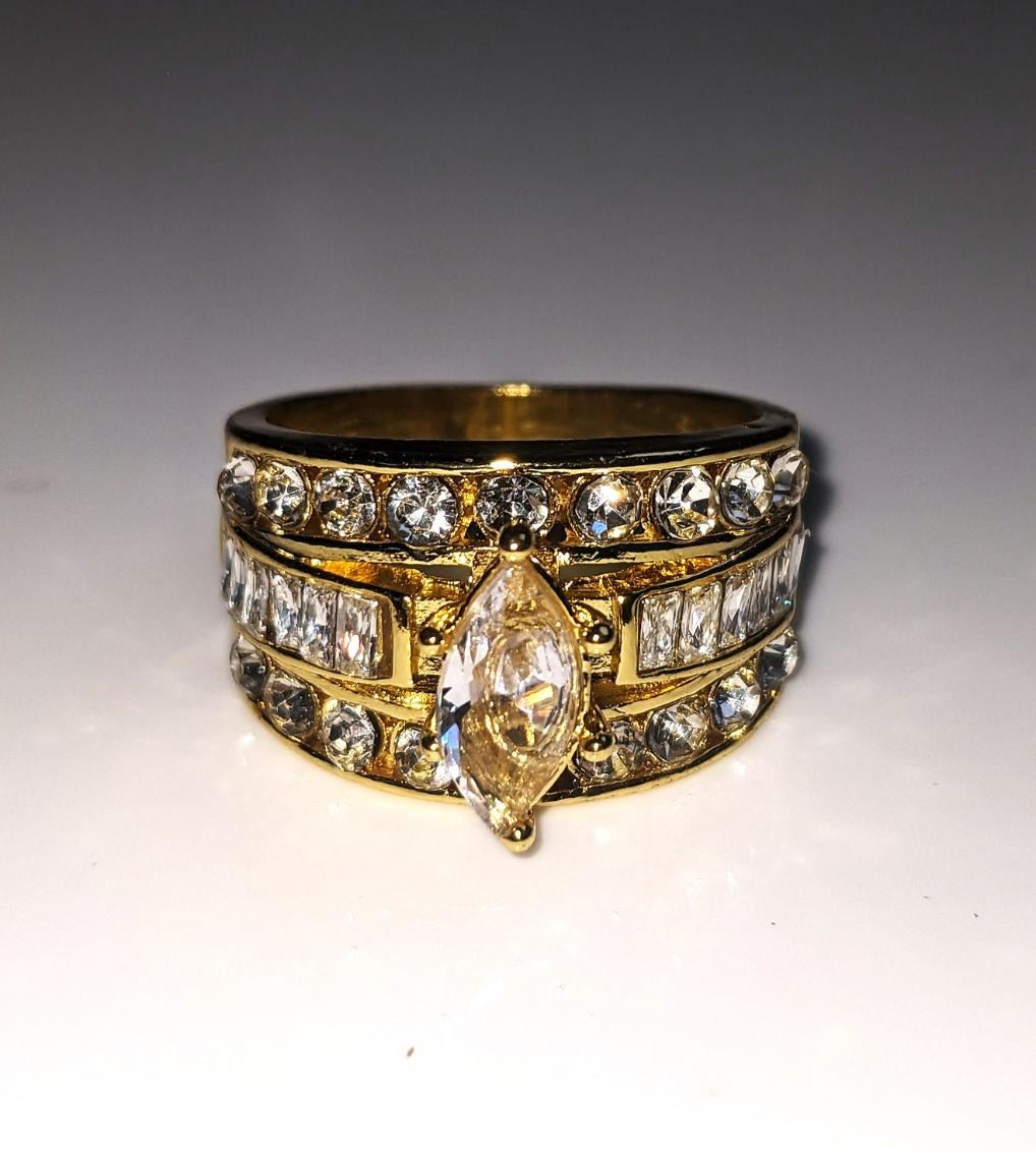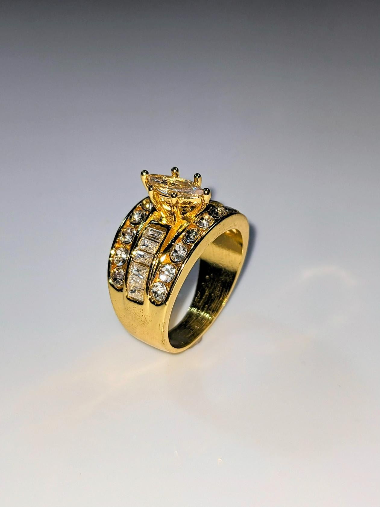 Ladies Sparkling 14 Kt Yellow Gold Plated 5 Cwt. Marquis Cut Lab Simulated Diamond Ring. This 3.35 Ct VVs1 Eye Clean Rare Marquis Cut Centerstone is complimented by 10 Fancy Baguette Cuts and 12 Brilliant Round Cut Lab Simulated Diamonds Total Gem Wt. Approx 5.65 Cttw.All 17 Gemstones Are Meticulously Mounted in 14 Kt Tri-Layered Yellow Gold Plate. This Ring is Gorgeous. Size 9. Total Gram Wt. is 8 Total Grams.