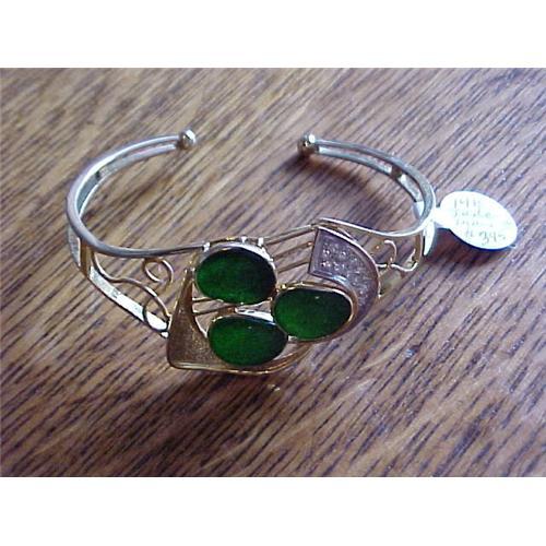 This is a wonderful 14KYG cuff style bracelet with diamonds and three pieces of jade.I would say it extends from 7-8 inches .It been tested to be sure of the gold content.