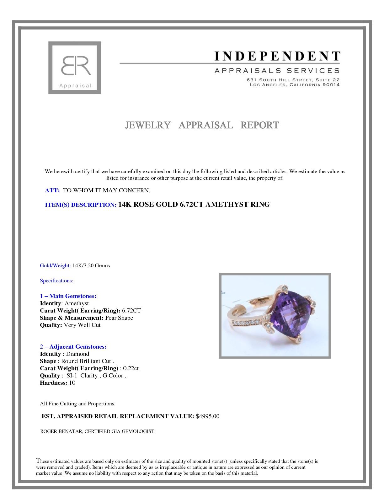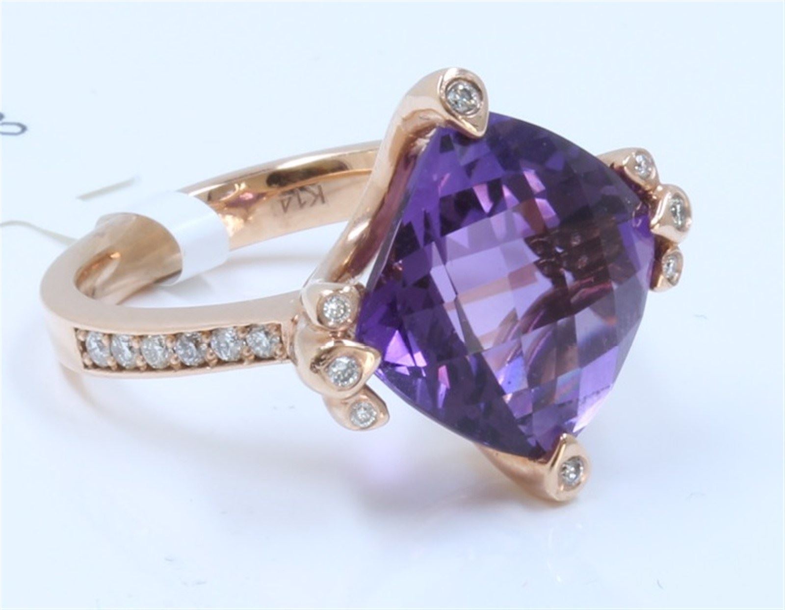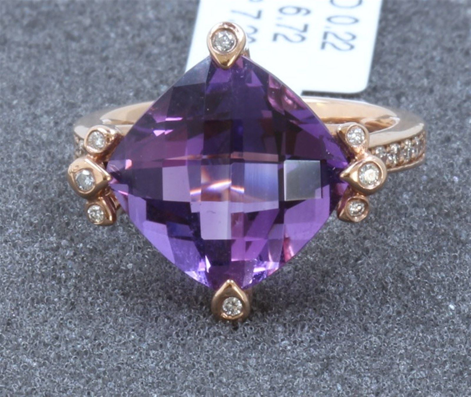 14 K ROSE GOLD AMETHYST RING:7.20 GRAMS/DIAMOND:0.22CT/AMETHYST:6.72CT/#R8010