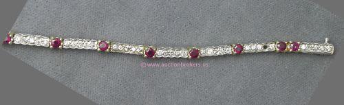 14 K WHITE AND YELLOW GOLD LADIES TENNIS STYLE LINK BRACELET SET WITH 50 ROUND BRILLIANT CUT DIAMONDS (ONE STONE MISSING) 1.5 CT AND 11 ROUND BRILLIANT CUT RUBIES APPROXIMATELY 1.65 CT. 12.4 GRAMS.