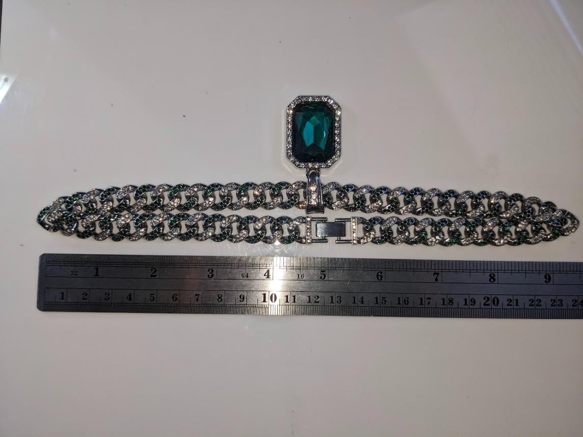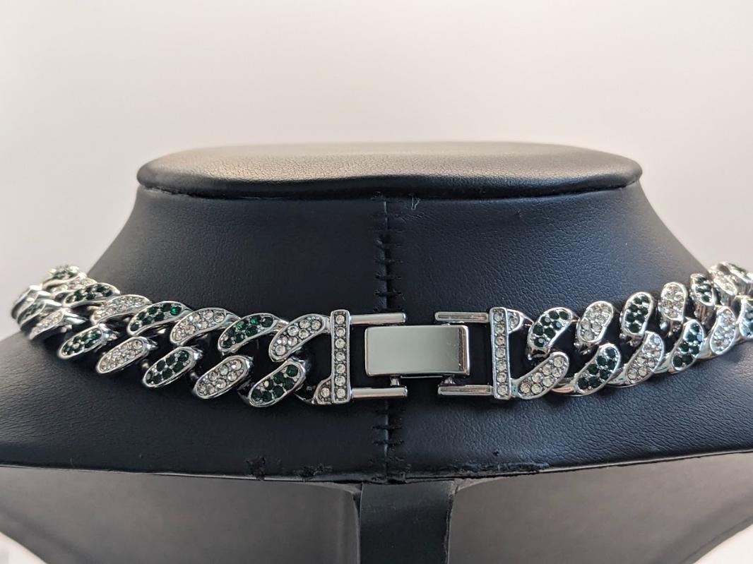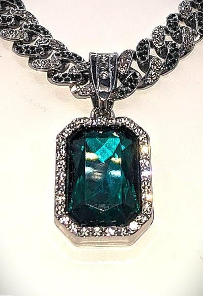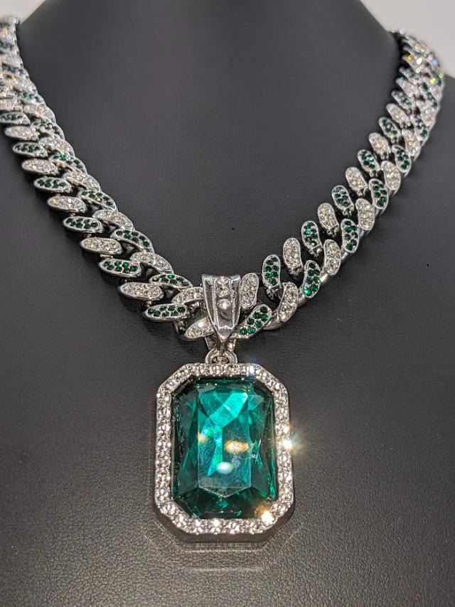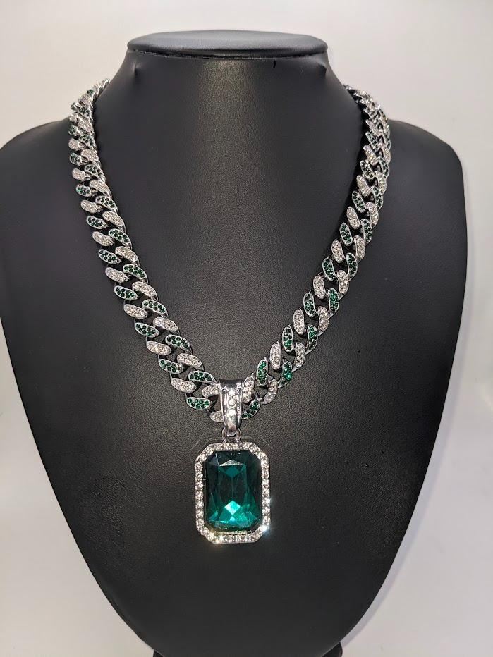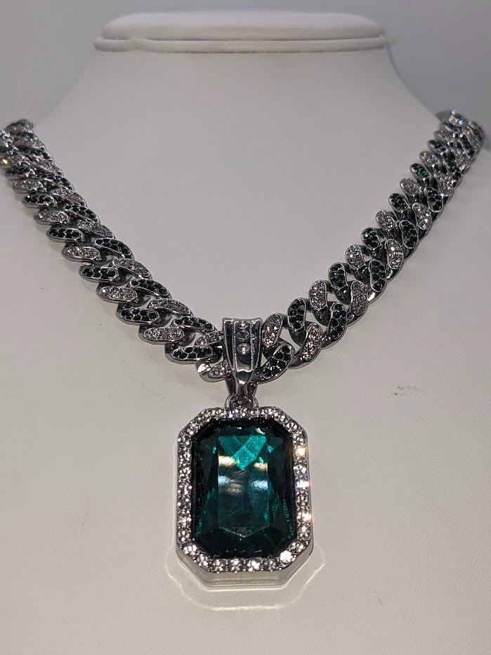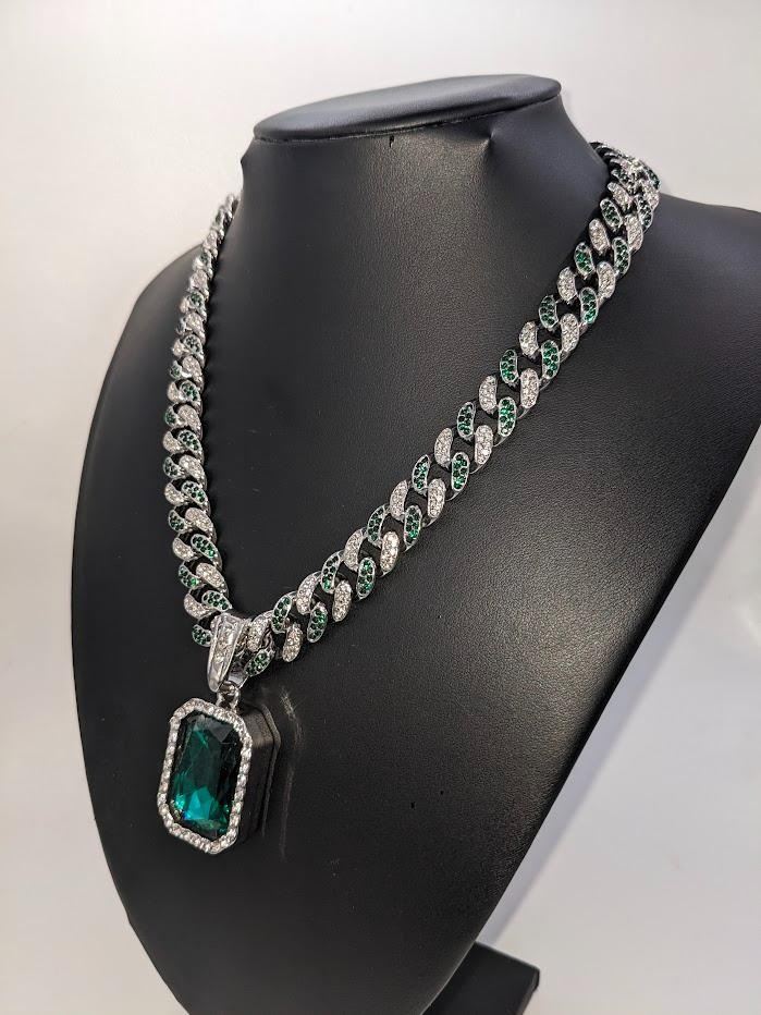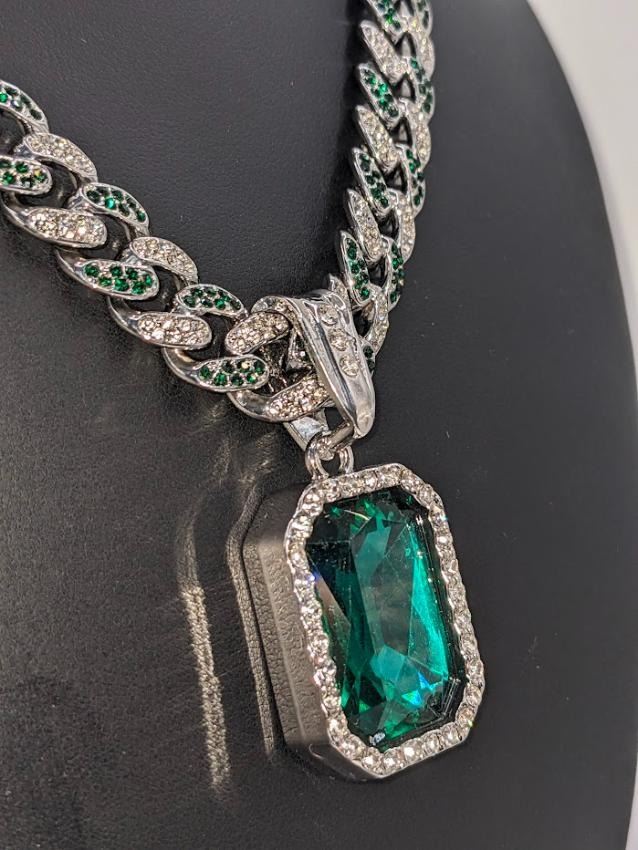 Gorgeous 14 Kt White Gold Simulated Emerald 95.8 Gram Chain Pendant Necklace, This Large 17.5 Ct Lab Simulated Emerald Centersone is an Emerald Cut Measuring 25 x 18 mm. It swings freely on a Miami Cuban Link Chain. This Chain Necklace is 18 " long and a measures a stealth 12 mm. wide. This pendant necklace is absolutely beautiful! Don't miss this one.