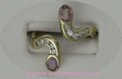 14 K YELLOW GOLD LADIES GEMSTONE AND DIAMOND RING SET WITH 10 CUBIC ZIRCONIA ROUND STONES AND TWO OVAL SHAPED PINK STONES. 3.2 GRAMS.