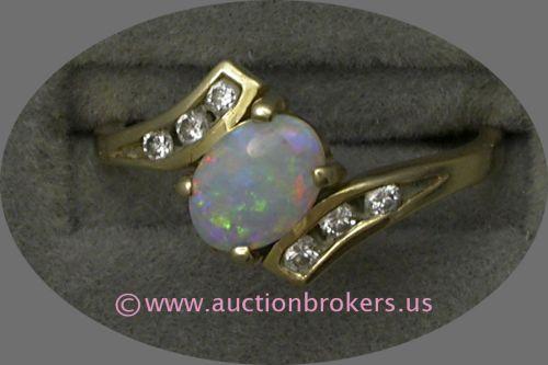 14 K YELLOW GOLD LADIES GEMSTONE RING SET WITH A CENTER OVAL CUT OPAL STONE .47 CT AND ACCENTED WITH 6 ROUND BRILLIANT CUT DIAMONDS .03 CT. 2.1 GRAMS.