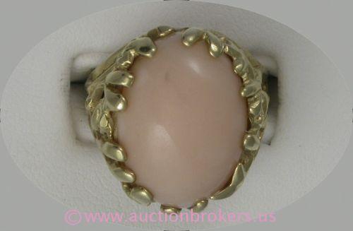 14 K YELLOW GOLD LADIES GEMSTONE RING SET WITH A CORAL CABOCHON 15 X 12 MM IN AN OPENWORK FREEFORM SETTING. 8.4 GRAMS.