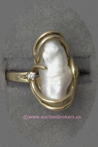 14 K YELLOW GOLD LADIES GEMSTONE RING SET WITH A OBLONG SHAPED FRESHWATER PEARL 7 X 10 MM AND ACCENTED WITH A PROMOTIONAL GRADE DIAMOND. 4.6 GRAMS.