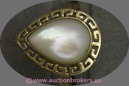 14 K YELLOW GOLD LADIES GEMSTONE RING SET WITH A PEAR SHAPED MOTHER-OF-PEARL STONE 7 X 11 MM BORDERED BY A GREEK KEY 14 K YELLOW GOLD FRAME. 2.9 GRAMS.