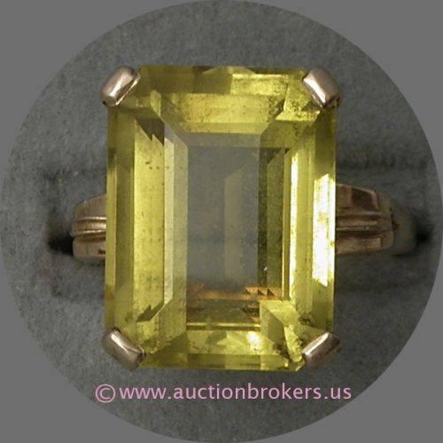 14 K YELLOW GOLD LADIES GEMSTONE RING SET WITH AN EMERALD CUT YELLOW TOPAZ STONE APPROXIMATELY 7 X 11 MM. 6.8 GRAMS.