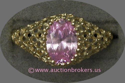 14 K YELLOW GOLD LADIES GEMSTONE RING SET WITH AN OVAL CUBIC ZIRCONIA PINK STONE. 3.1 GRAMS.