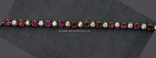 14 K YELLOW GOLD LADIES TENNIS STYLE BRACELET SET WITH 28 RUBY STONES 1.4 CT. 7.9 GRAMS.