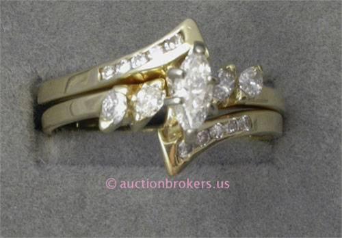 14 K YELLOW GOLD LADIES TWO-PIECE WEDDING RING SET THAT IS SET WITH A MARQUISE CUT DIAMOND .25 CT AND FLANKED BY 10 ROUND BRILLIANT CUT DIAMONDS .05. ACCOMPANYING THIS RING IS A 14 K YELLOW GOLD RING GUARD SET WITH 4 MARQUISE CUT DIAMONDS .72 CT. 5.6 GRAMS.