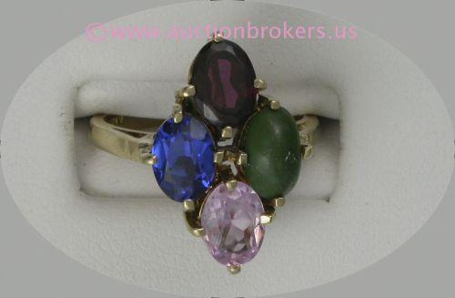 14 K YELLOW GOLD VINTAGE MOTHERS RING SET WITH OVAL AND PEAR SHAPED JADE, BLUE SAPPHIRE, RUBY, AND PINK SAPPHIRE, EACH APPROXIMATELY 6 X 4 MM. 4.5 GRAMS.
