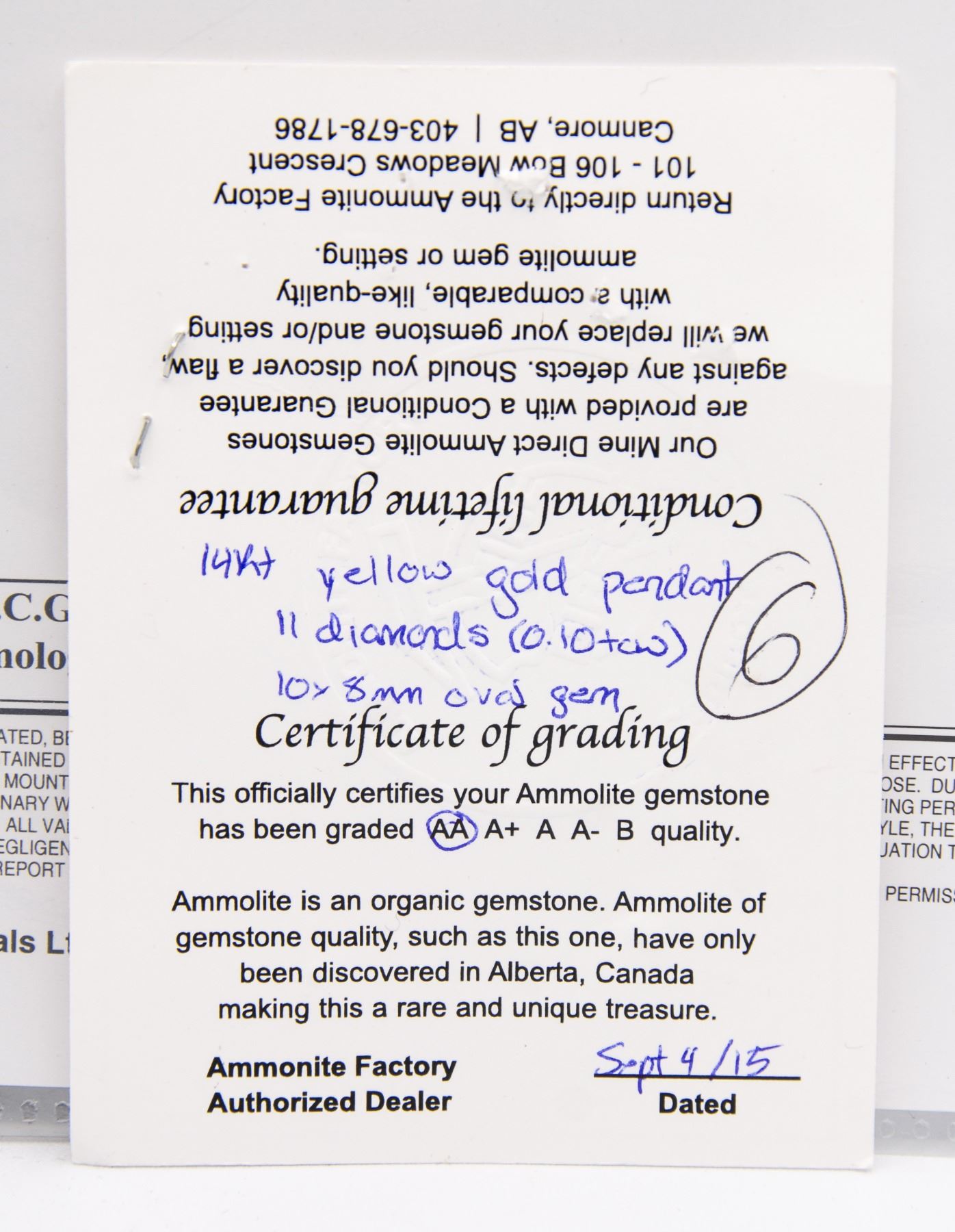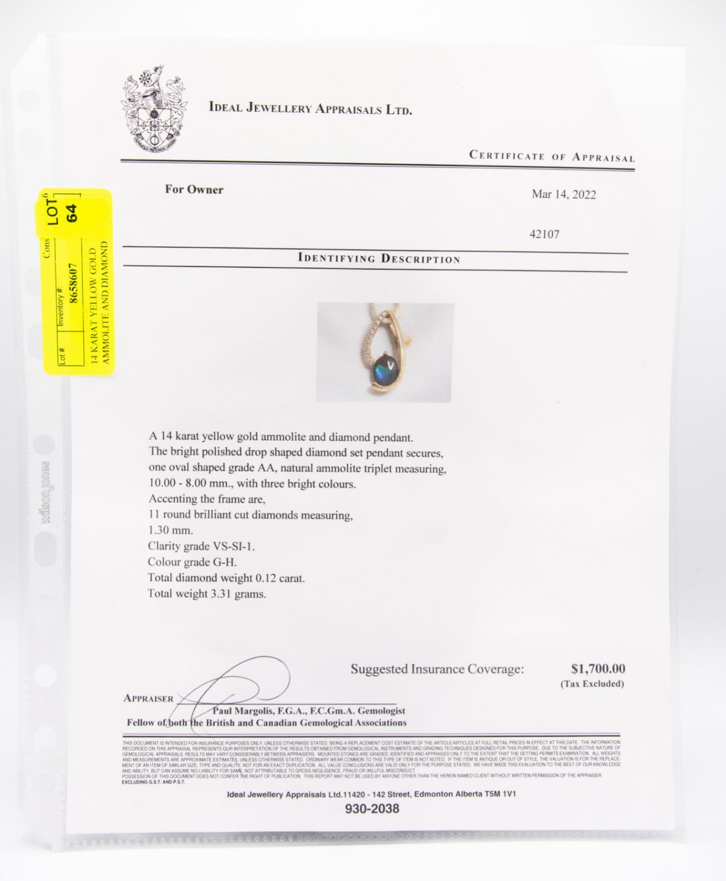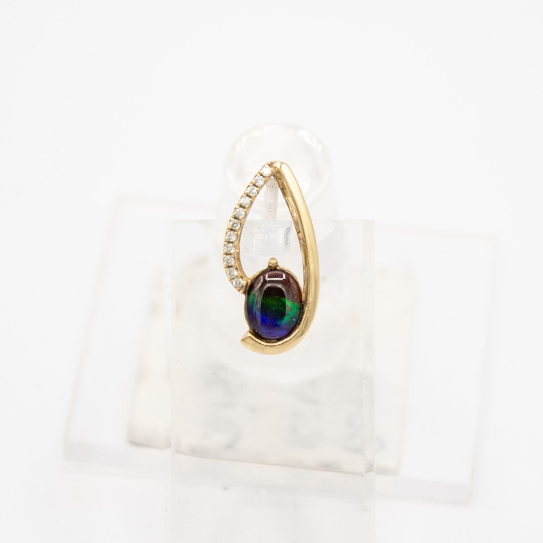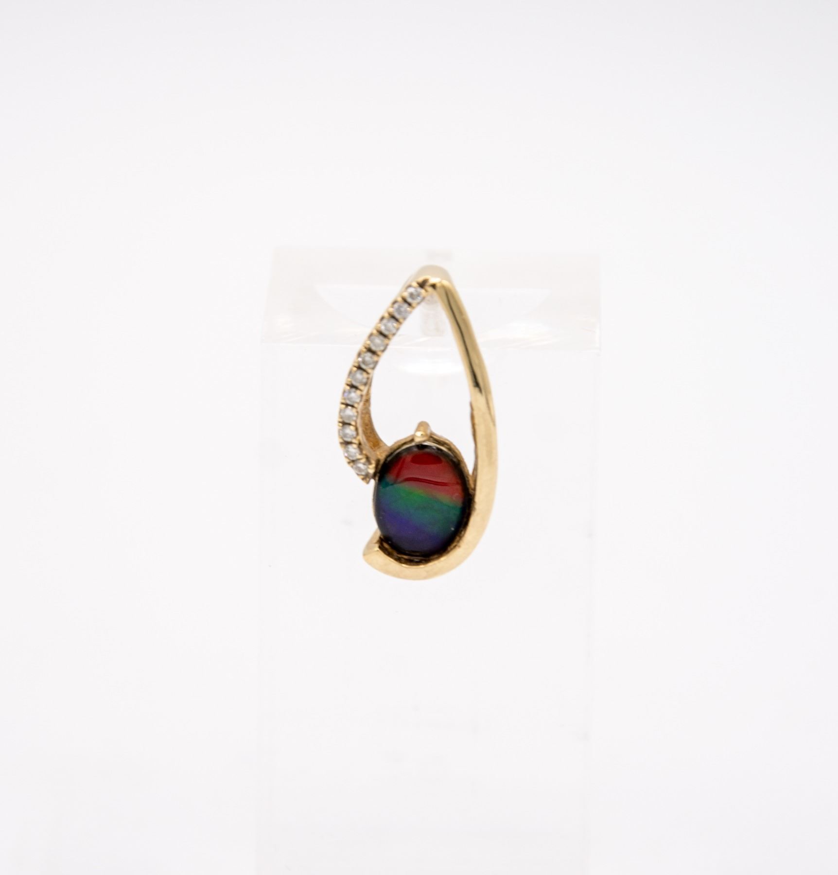 THE BRIGHT POLISHED DROP SHAPED DIAMOND SET PENDANT SECURES ONE OVAL SHAPED GRADE AA, NATURAL AMMOLITE TRIPLET MEASURING 10.00 - 8.00MM, WITH THREE BRIGHT COLOURS. ACCENTING THE FRAME ARE, 11 ROUND BRILLIANT CUT DIAMONDS MEASURING 1.30MM.CLARITY GRADE VS-SI-1. COLOUR GRADE G-H. TOTAL DIAMOND WEIGHT 0.12 CARAT. TOTAL WEIGHT IS 3.31 GRAMS. COMES WITH A CURRENT APPRAISAL VALUED AT $1700