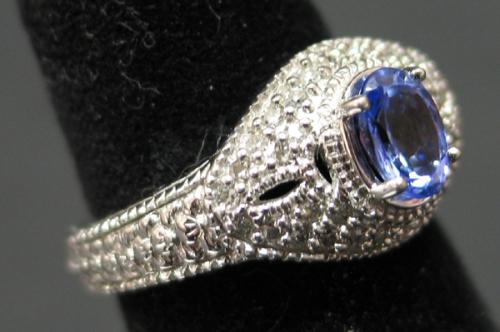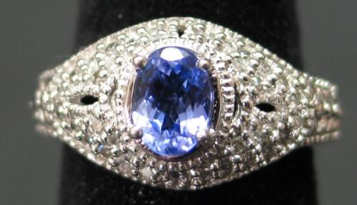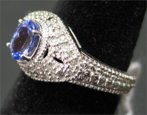 14 KT WHITE GOLD RING. Contains 7x5 mm oval tanzanite colored center stone, deep violet color & very clear. Also has 32-.01 ct. round diamonds on sides. 6.1 grams wt. Ring size 6. CAGA appraisal.