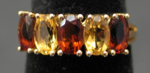 14 KT YELLOW GOLD RING. Contains approx. 1.65 c.t.w. of garnets in 3-6x4 mm garnet oval stones. Also has 1.10 c.t.w. of citrine in 2-6x4 mm citrine stones. 3.3 grams wt. Ring size 5 ¾. CAGA appraisal.