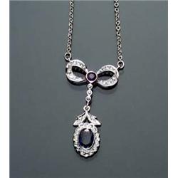 14-Karat White Gold, Blue Sapphire and Diamond Necklace Set with one oval and one round faceted dark blue sapphire weighing approximately 1.25 carats and thirty-six rose cut diamonds weighing approximately .70 carats. Length: 17-1/2 in (44.5 cm) $500 - $700