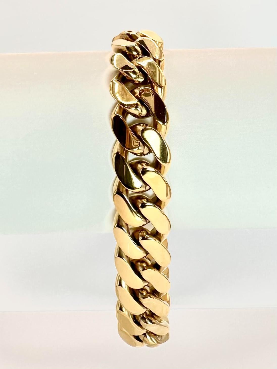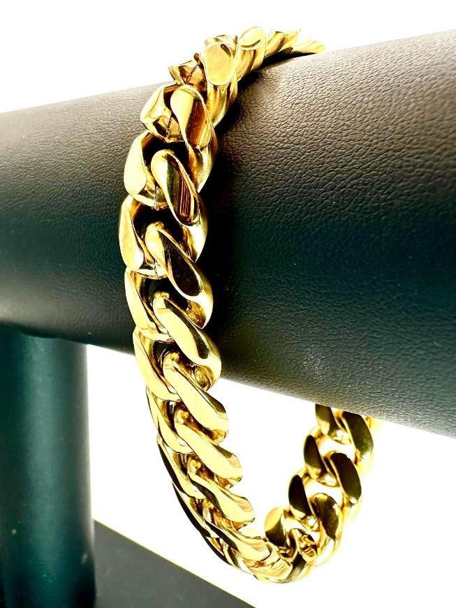 14 Kt Yellow Gold Plate 74.6 Grams Monogramed Initial "A" Curb Link Bracelet, This well made Strong and Durable Heavy 14 Kt Yellow Gold Plate Curb Link Monogrammed "A" Bracelet weighs 74.6 Total Grams, It measures approx. 10" in length and is approx., 14 mm. wide.