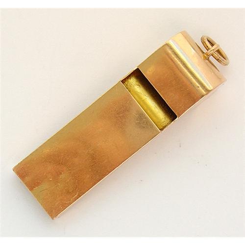 Vintage whistle of pink gold. The simplicity of the streamlined design is outstanding. Lightly fluted at the mouthpiece, the whistle tapers like a musical note. A hanging ring is linked to the resonance chamber. There is superficial abrasion and slight dent that is within the realm of normal wear for an item of this age.