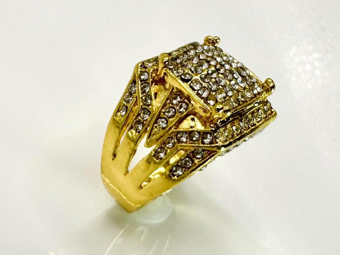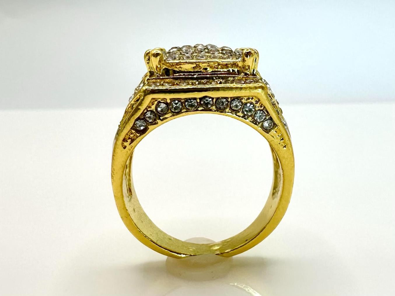 One Men's Handsome 14 Kt 7.75 Cttw Lab Simulated Diamond Ring. These Sparkling Gemstones are all Eye-Clean and Mounted in 14 Kt. Yellow Gold, this ring is well made with strong detail. Hard To Find A-1 Quality Big Man's Size 12. Total gram Wt. is a stealth 13.7 grams.