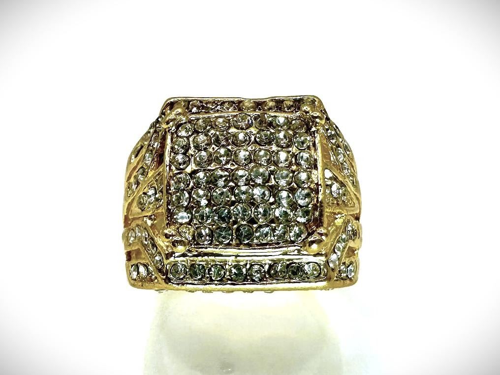 One Men's Handsome 14 Kt 7.75 Cttw Lab Simulated Diamond Ring. These Sparkling Gemstones are all Eye-Clean and Mounted in 14 Kt. Yellow Gold, this ring is well made with strong detail. Hard To Find A-1 Quality Big Man's Size 12. Total gram Wt. is a stealth 13.7 grams.