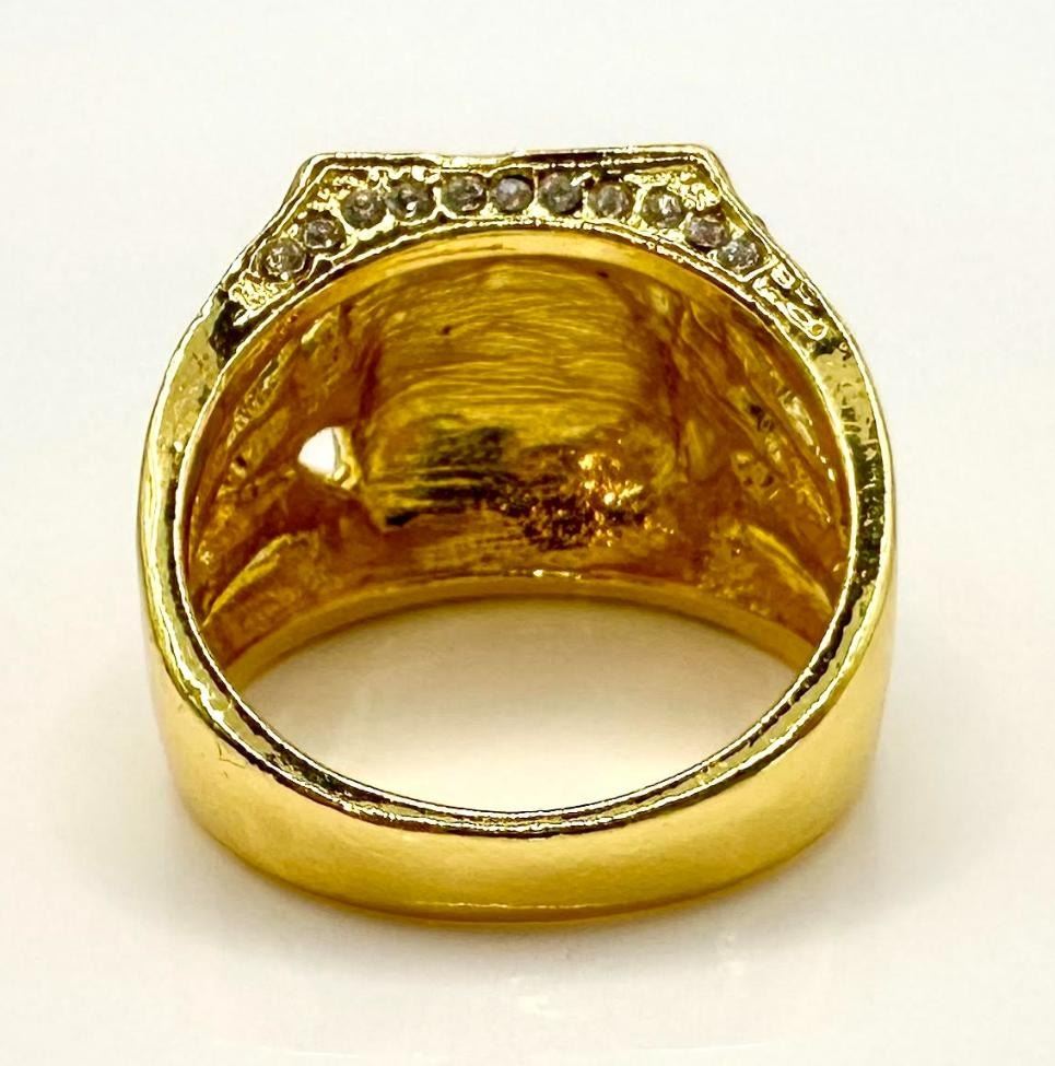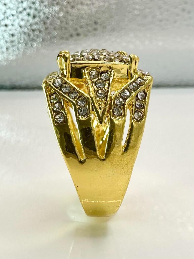 One Men's Handsome 14 Kt 7.75 Cttw Lab Simulated Diamond Ring. These Sparkling Gemstones are all Eye-Clean and Mounted in 14 Kt. Yellow Gold, this ring is well made with strong detail. Hard To Find A-1 Quality Big Man's Size 12. Total gram Wt. is a stealth 13.7 grams.