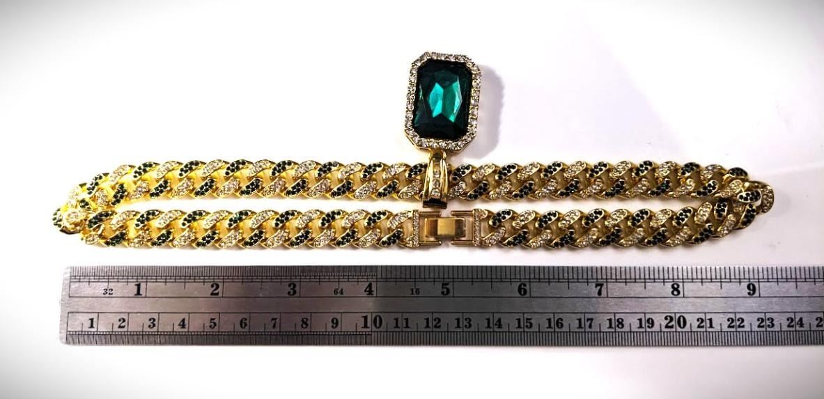 Gorgeous 14 Kt Yellow Gold Simulated Emerald 91 Gram Chain Pendant Necklace, The Lab Simulated Emerald Centersone is a majestic 17.5 Ct Emerald Cut Measuring 25 x 18 mm. It swings freely on a Miami Cuban Link Chain. This Chain Necklace is 18 " long and a measures a stealth 12 mm. wide. This pendant necklace is Gorgeous! Don't miss this one.