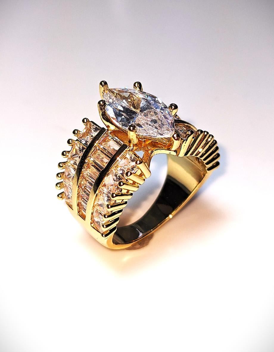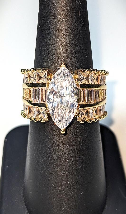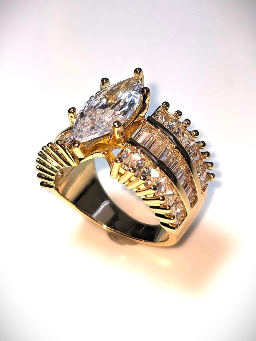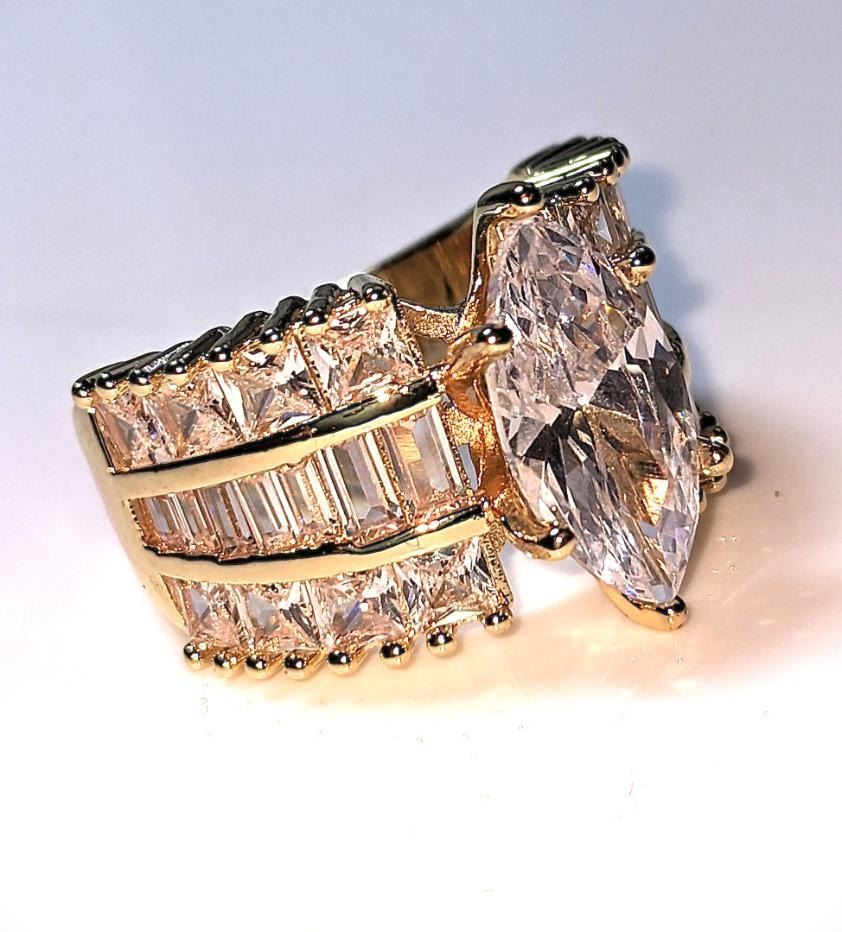 Ladies Sparkling 14 Kt Yellow Gold Plated 4.65 Ct Marquis Cut Lab Simulated Diamond Ring. This 4.65 Ct White Eye Clean Marquis Cut Centerstone is complimented by 14 Fancy Baguette Cuts and 14 Princess Cut Lab Simulated Diamonds Total Gem Wt. Approx 6.75 Cttw. All 29 Gemstones Are Meticulously Mounted in 14 Kt Yellow Gold Plate. This Ring is Gorgeous. Size 7 Total Gram Wt is 8 Total Grams.
