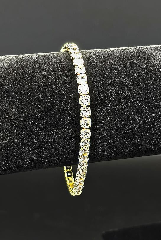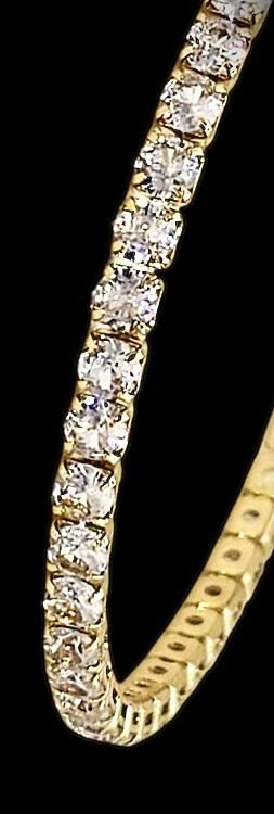 Sparkling 5.75 Ctw Lab Diamond Tennis Bracelet. These Sparkling Gemstones measure approximately 4mm and are eye clean. They are gold plated, mounted in 14 Kt Yellow Gold Plating. The Yellow Gold Plate Gives This Bracelet It's High Polish and Shine. It is also tarnish resistant. This bracelet is approx. 7" in length and weighs 7.3 Total Grams. Elegant and Sporty and always In style anytime anywhere!