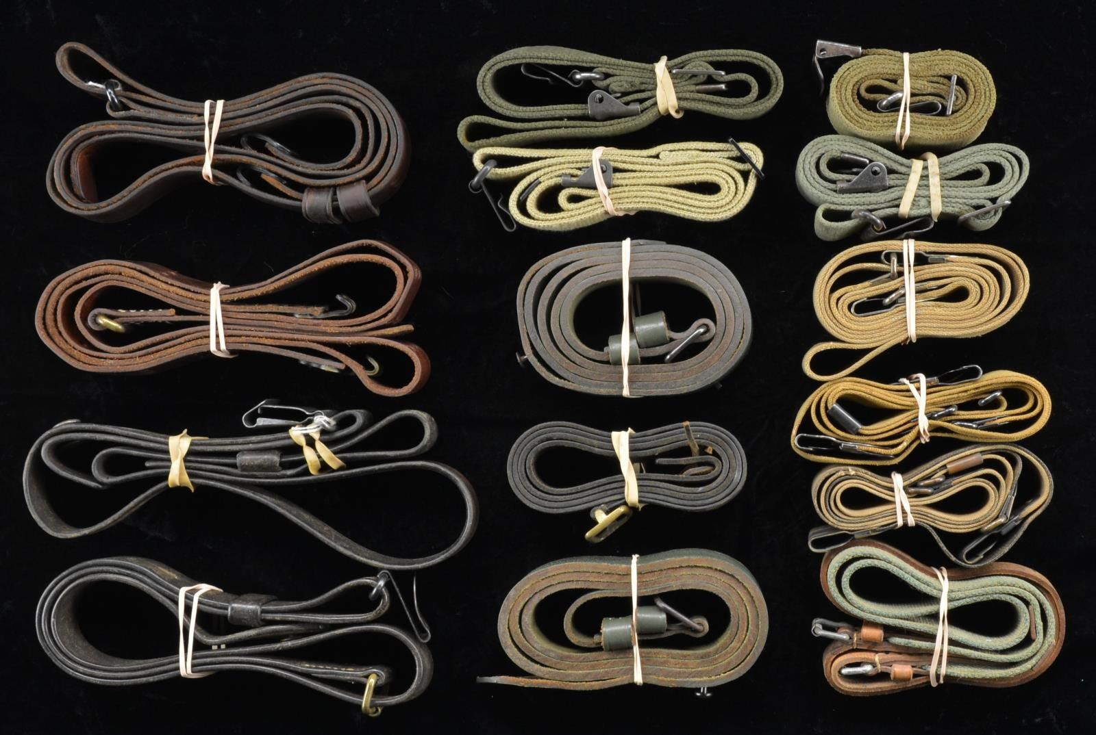 2 Green 1909 Argentine Mauser slings. / 2 brown leather Swedish Mauser sling. / Portuguese Vergueiro Mauser sling w/ leather thong & marks "AE" near buckle. / Green web sling for Soviet PPS-43 SMG. / CONDITION: good overall w/ wear, flexing & staining commensurate w/ age. (02-16324/MD). $200-400.