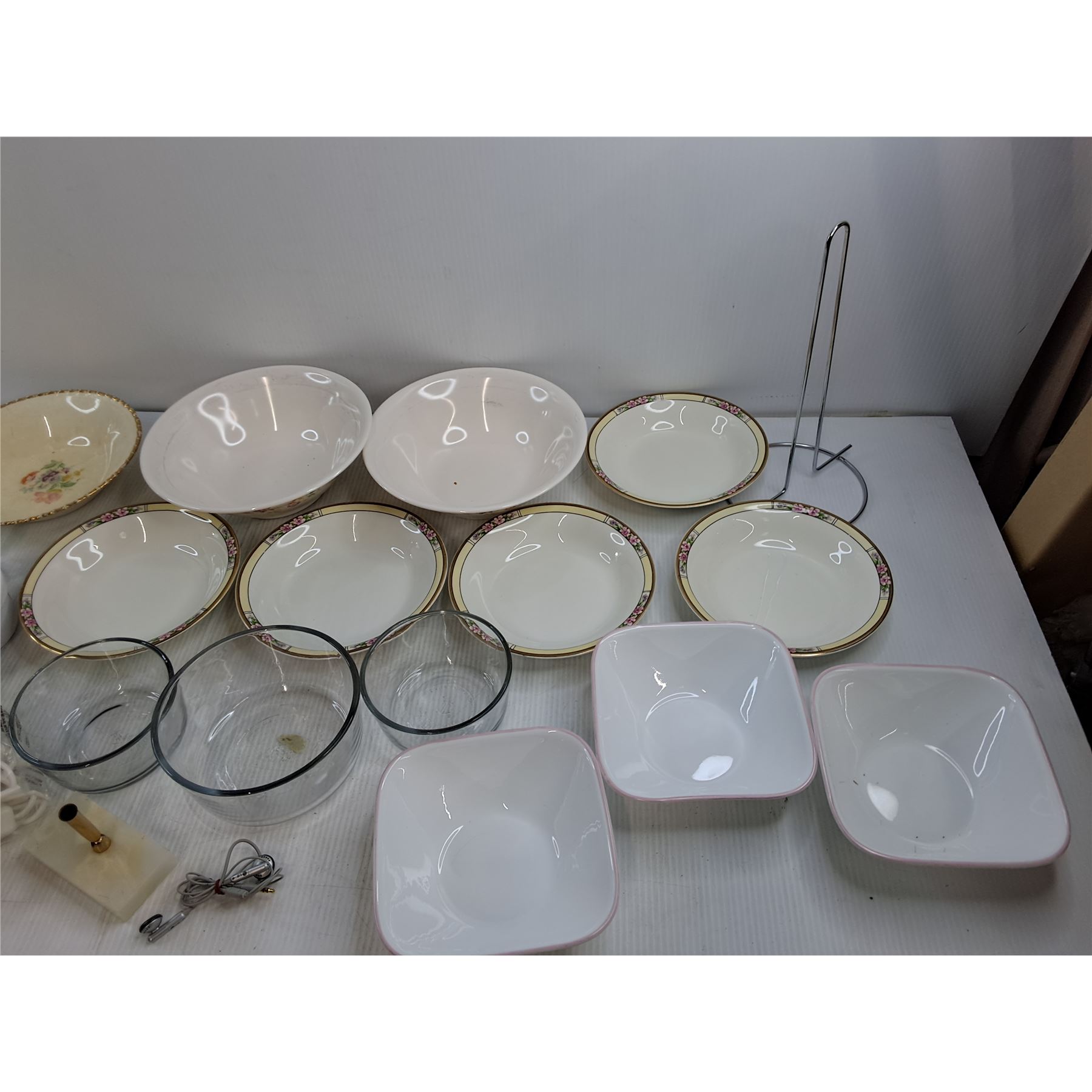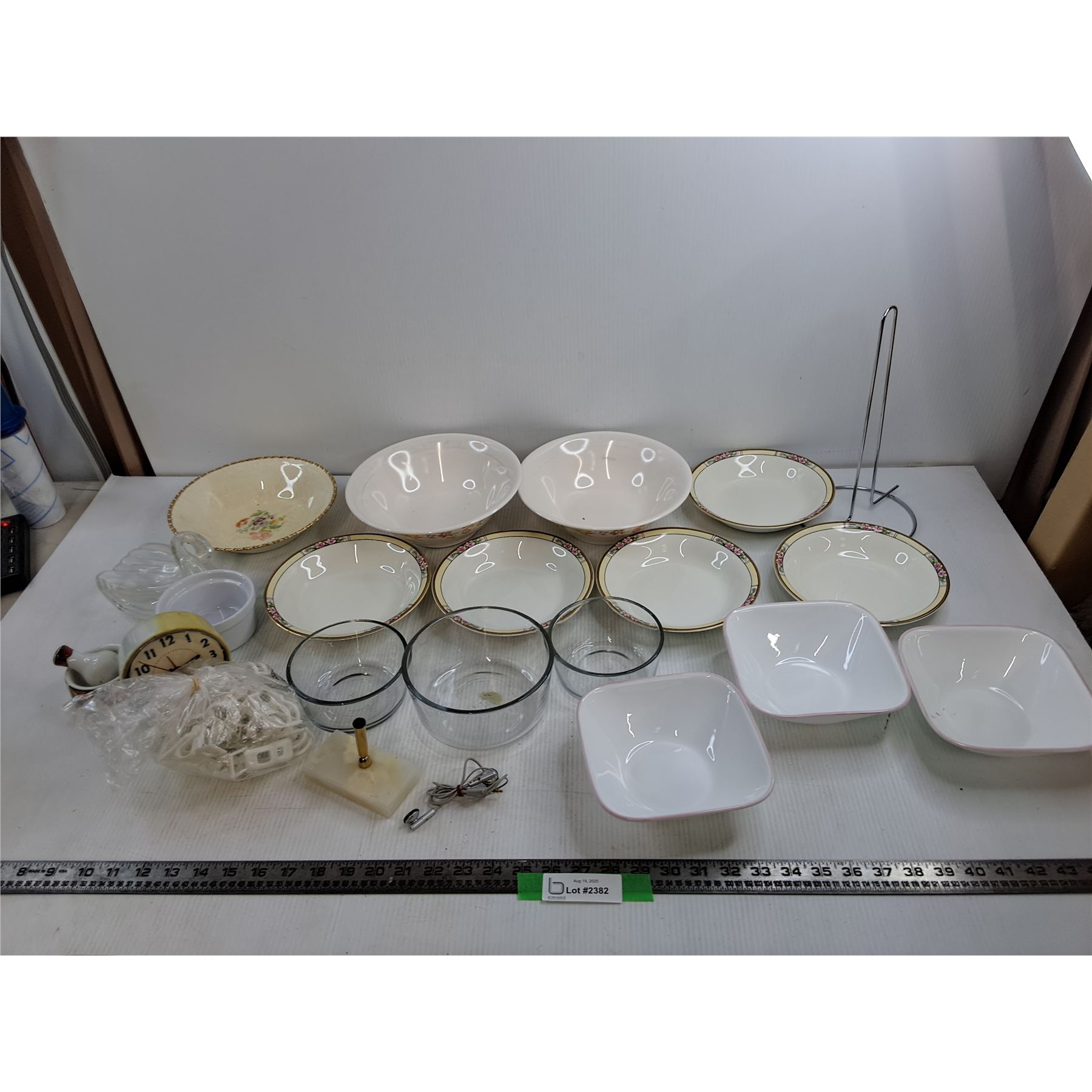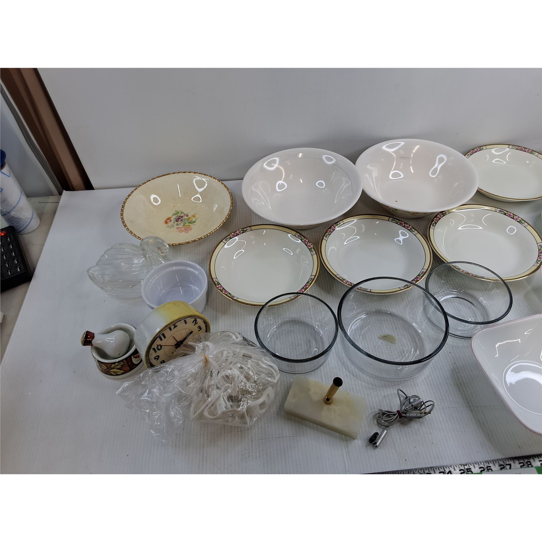 (14) Misc Bowls, Westclox Alarm Clock, LG Earbuds, Misc
