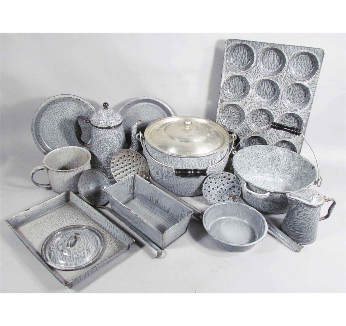 14 Misc. Pieces of Grey Graniteware. Coffee Pot and muffin pan and more. Some minor chips otherwise overall good condition.
