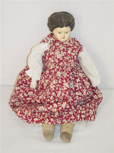 14 PAPIER MACHE HEAD DOLL W/ KID BODY, CLOTH LEGS