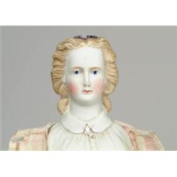 Lot # 31 14" PARIAN. Kid body, with old clothes. A wonderful doll with molded blouse and collar. Blonde hair with molded blue decoration. CONDITION: Decoration has some loss of blue in the luster flowers in hair and hands are rough. otherwise very good. 1-29158 (450-750)