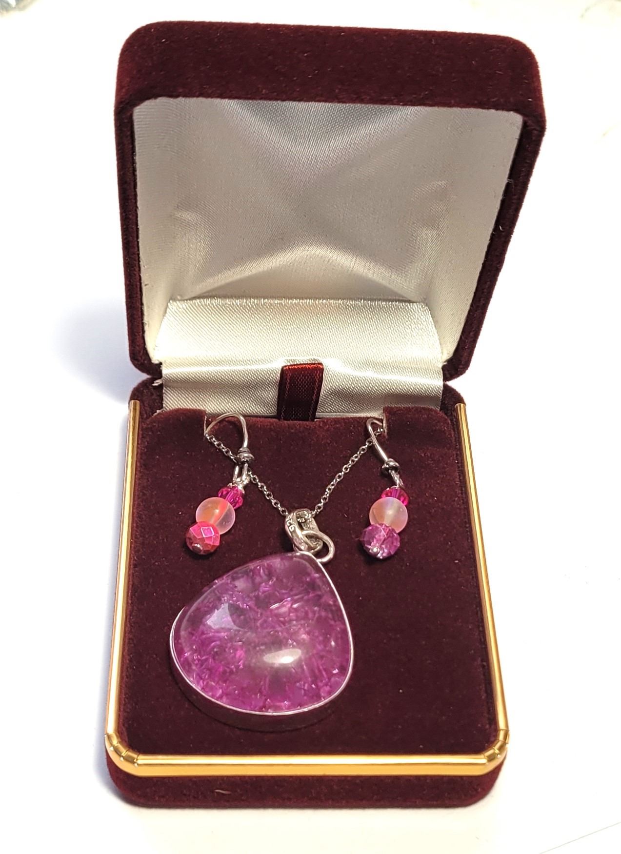 WITH SILVER TONE ON 18" CHAIN AND COORDINATING DROP EARRINGS WITH CRYSTALS. JEWELERY