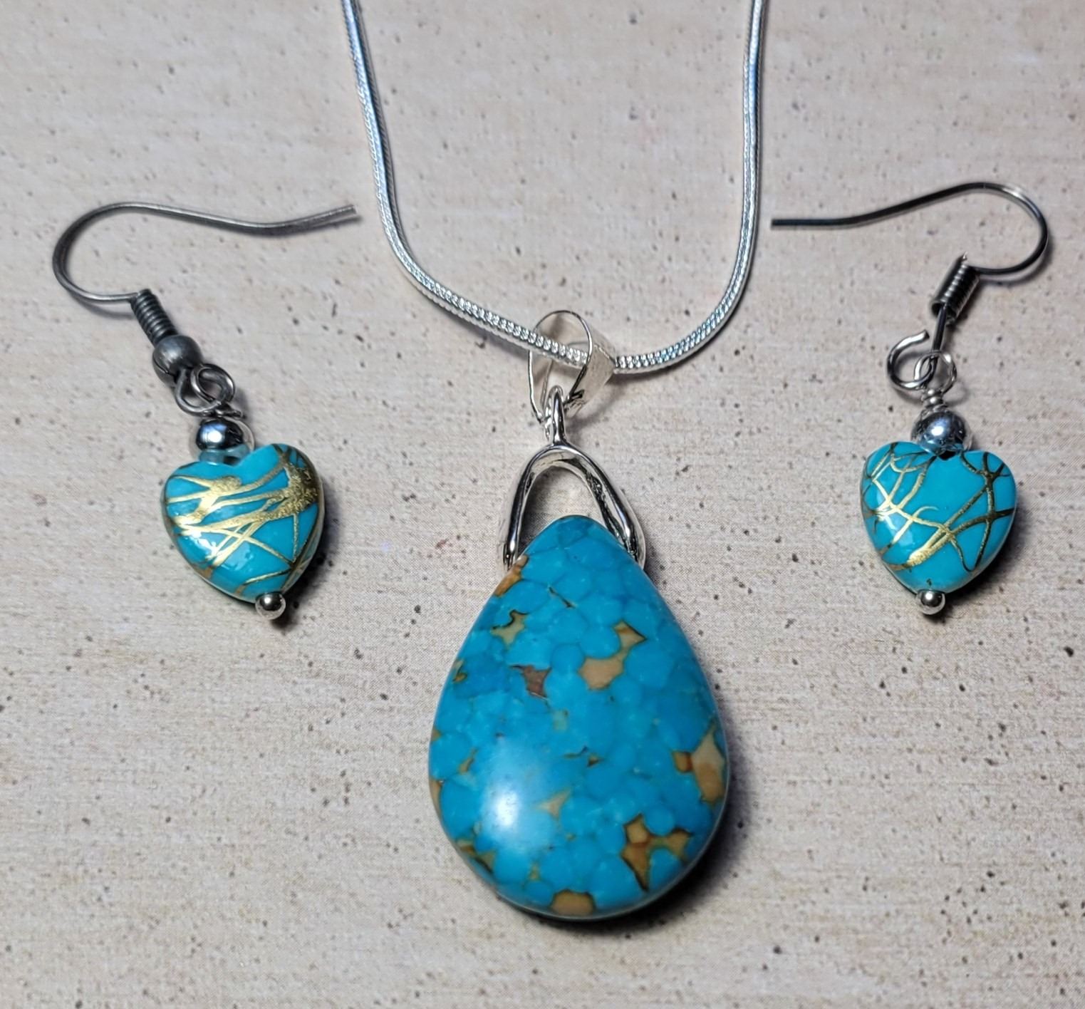 PENDANT ON 18" CHAIN & COORDINATING HEART SHAPED EARRINGS. JEWELERY